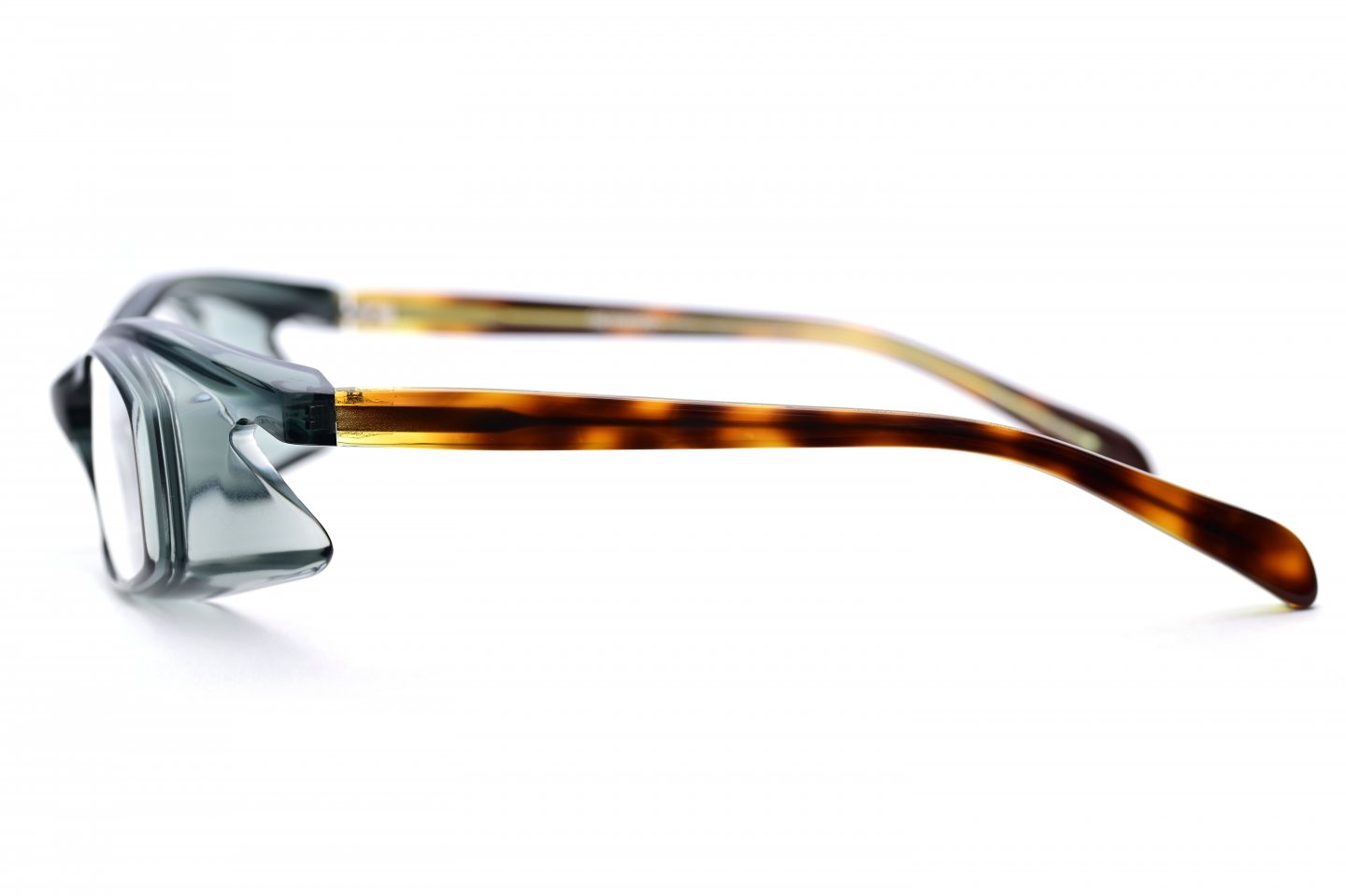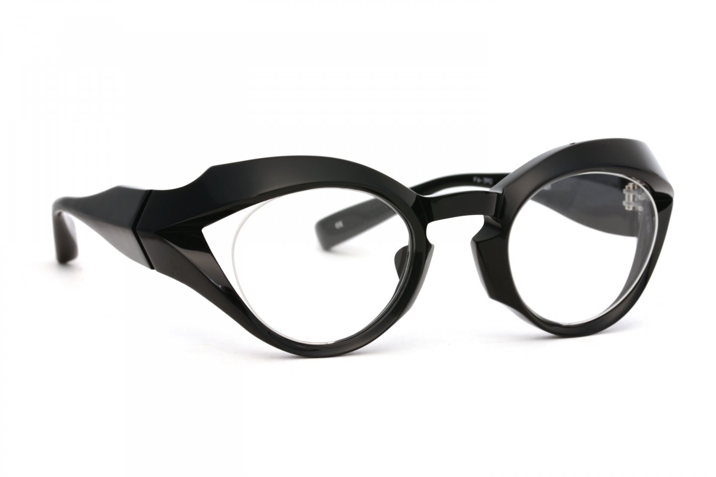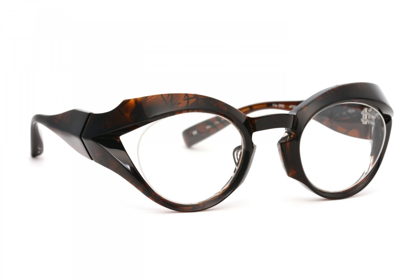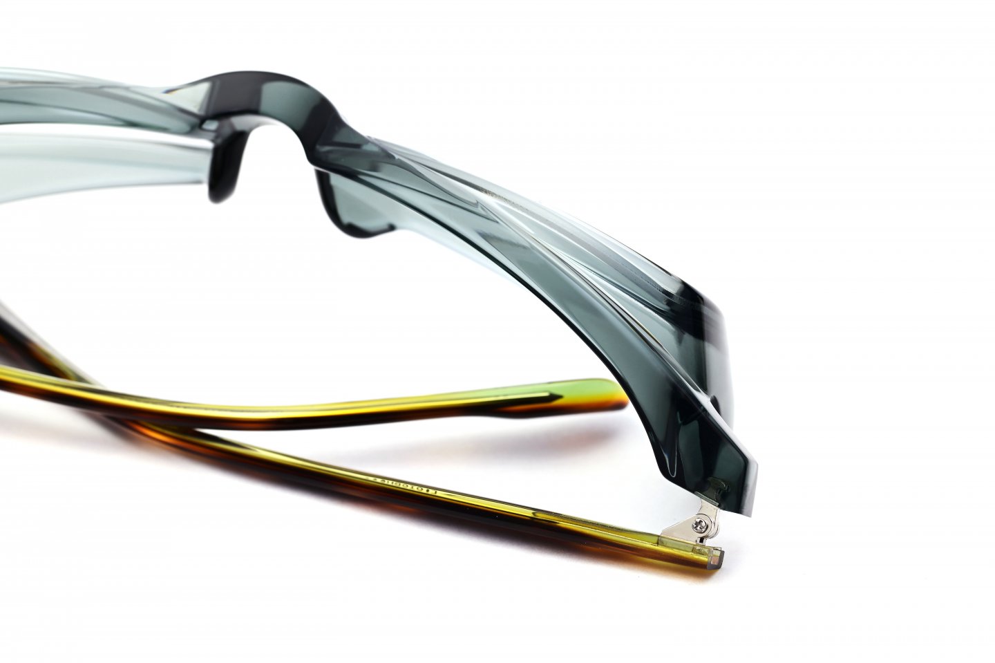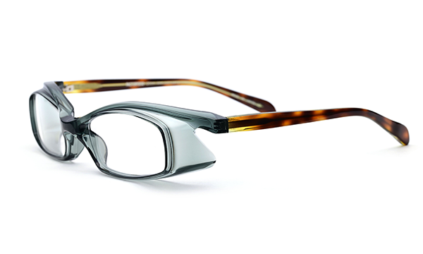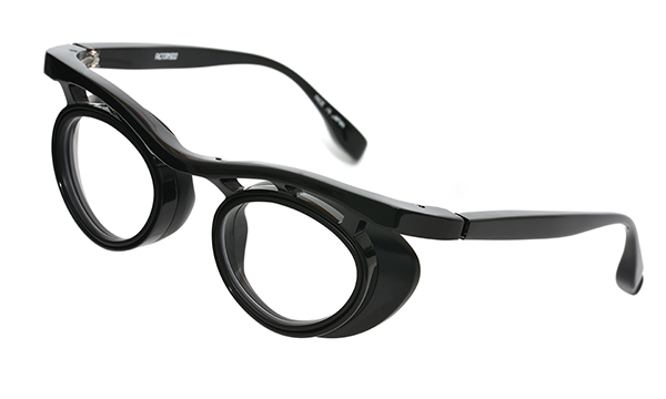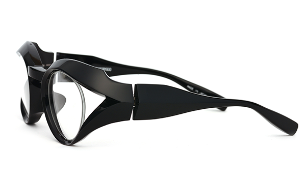 1枚のアセテートシートからつくられた、立体的なブロータイプのゴーグル型メガネ。アセテートという素材の可能性を信じ、技術的に非常に難易度の高い、当時では他に類を見ない立体的な造形にチャレンジしたことで、間違いなくブランドとしての大きな扉を一つ開けたモデルです。