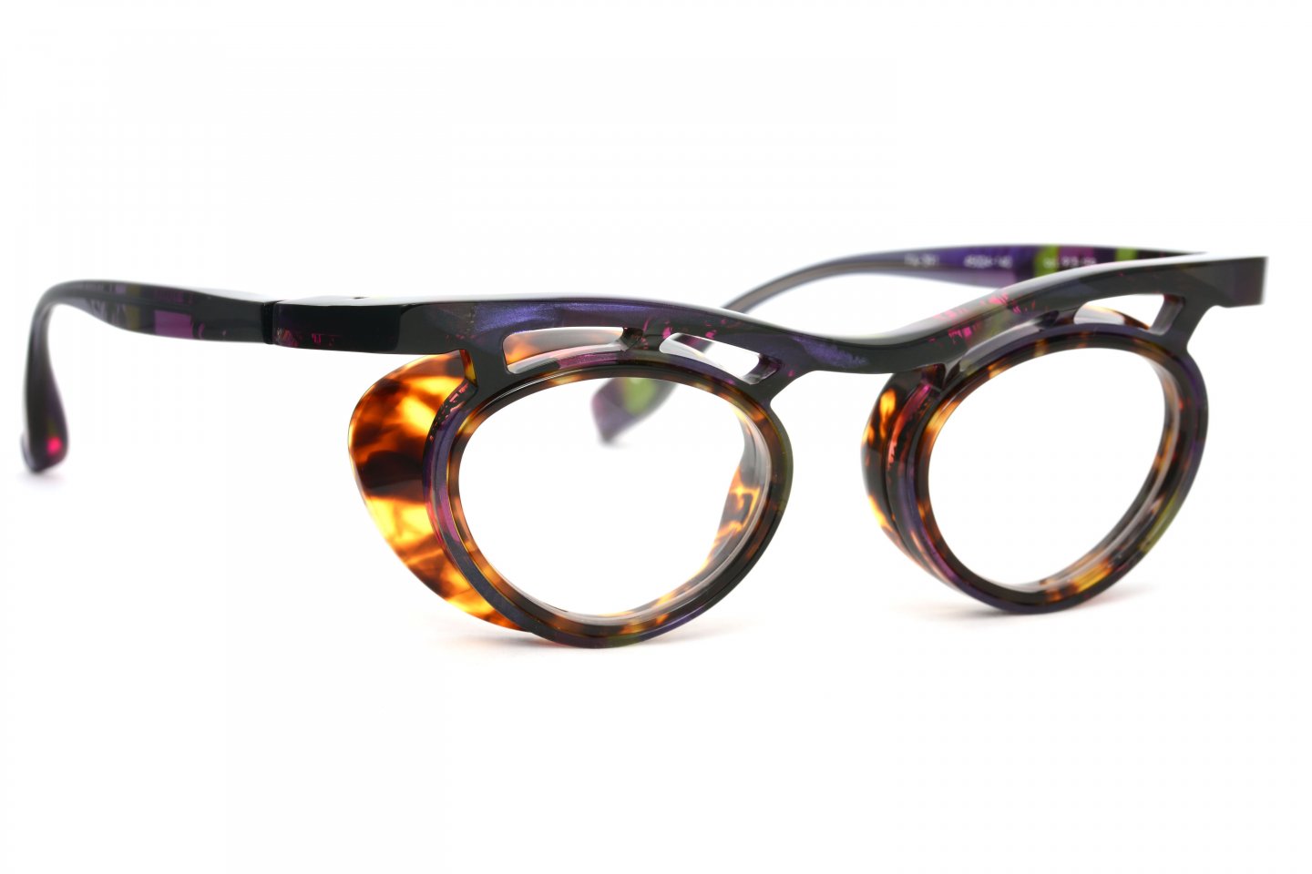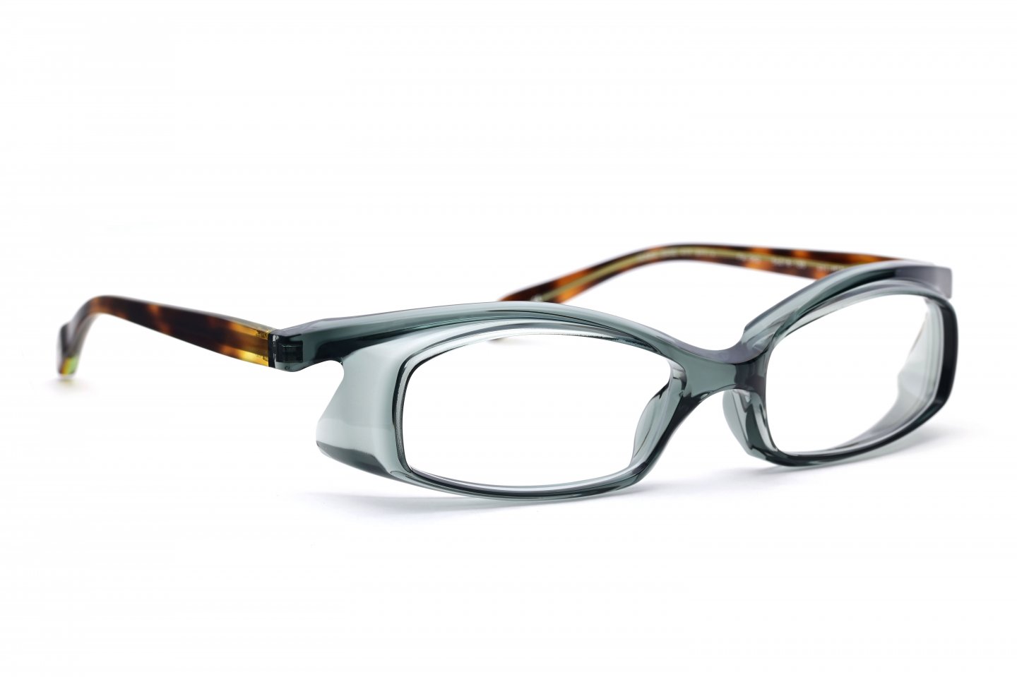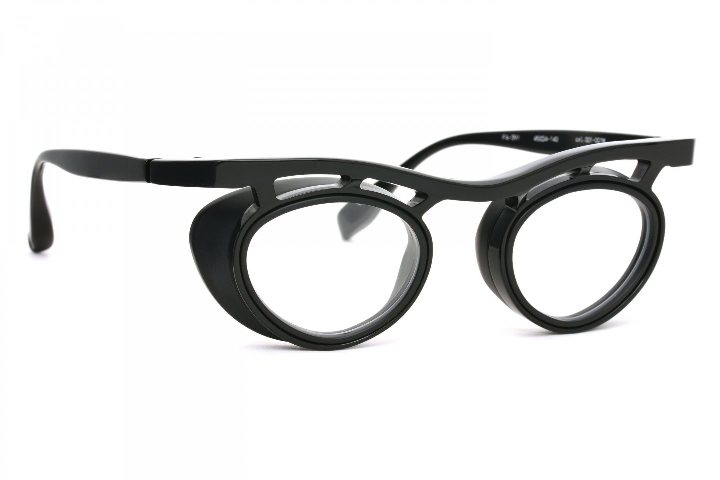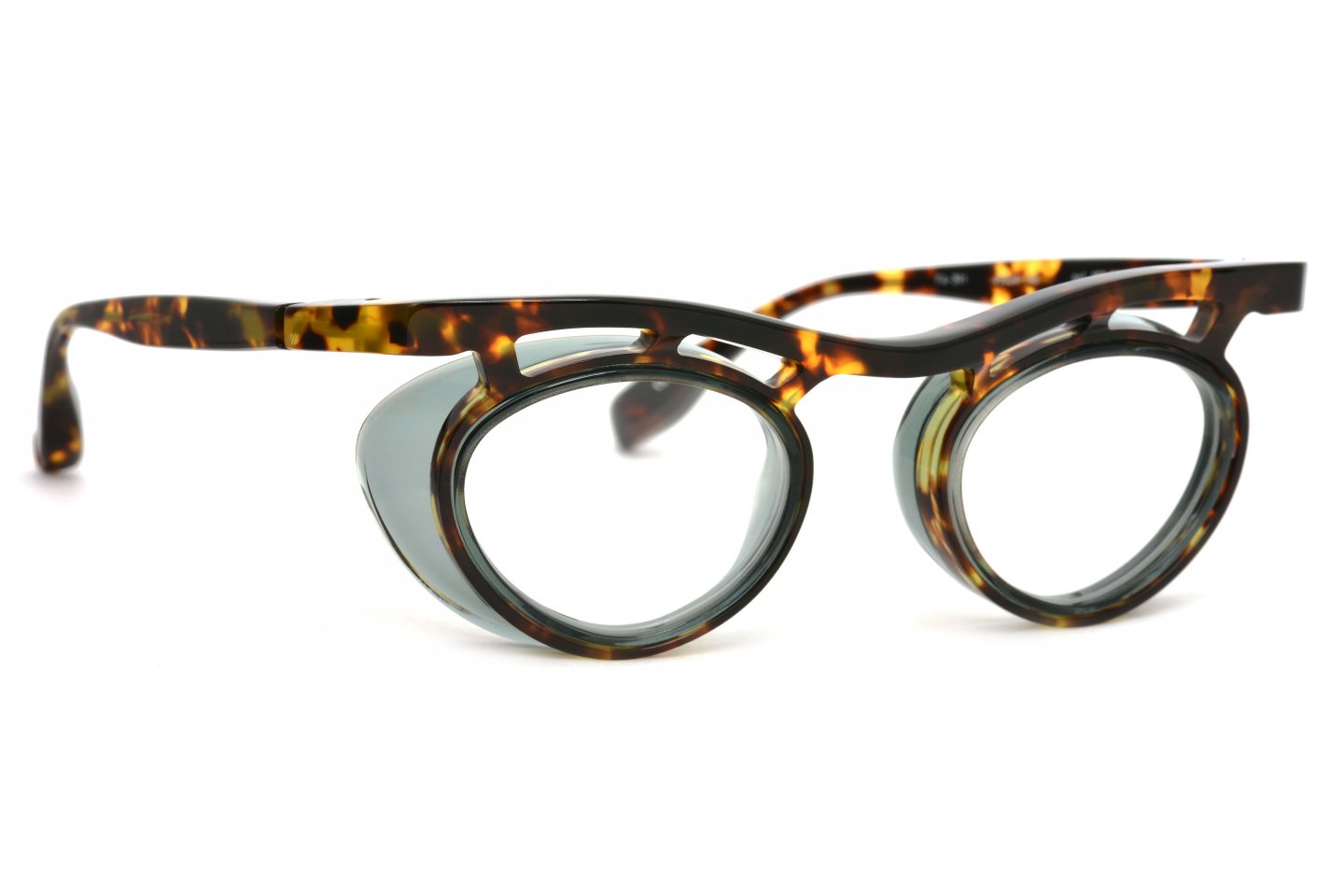 1枚のアセテートシートからつくられた、立体的なブロータイプのゴーグル型メガネ。アセテートという素材の可能性を信じ、技術的に非常に難易度の高い、当時では他に類を見ない立体的な造形にチャレンジしたことで、間違いなくブランドとしての大きな扉を一つ開けたモデルです。