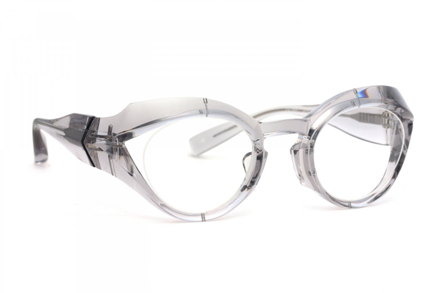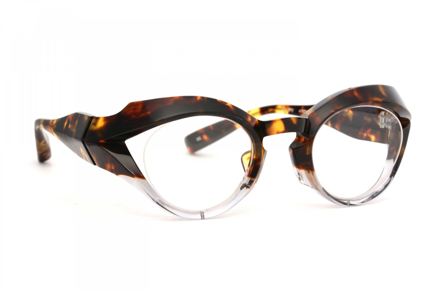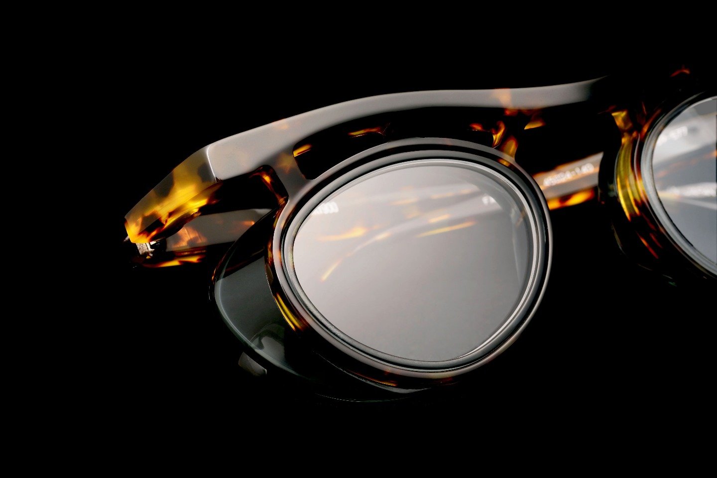 面の広さやボリュームから、見た目や顔に合わせた時のインパクトは大きい。その反面、きちんとつじつまの合ったライン、細部にまで行き届いた面の作り込みによる造形がこのモデルの完成度を高め、安心感をも感じられる仕上がりとなった。さらに、全体を纏うエッジがクラシックスタイルの玉型と相反し、“違和感”を越えた“新しさ”を感じさせる。