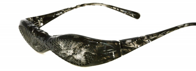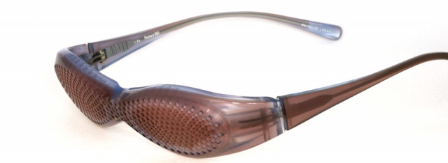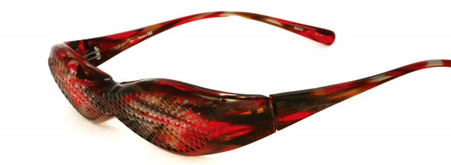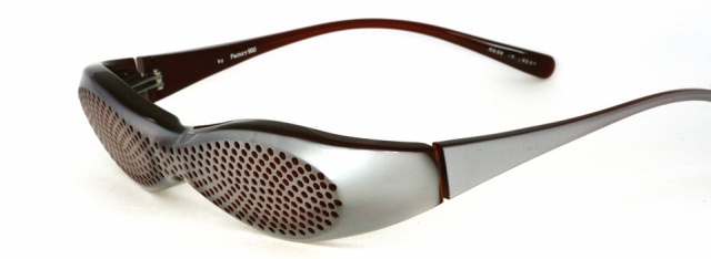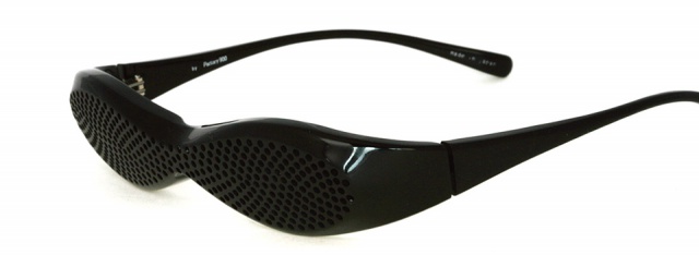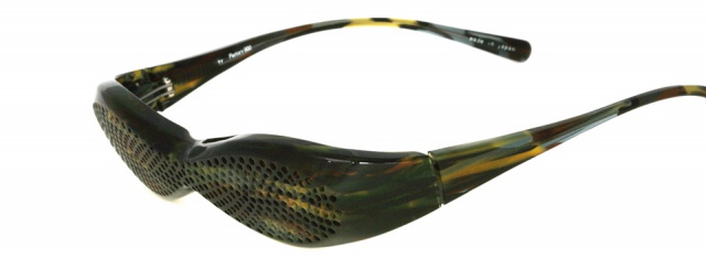 FA-082とは別の方法で、眼鏡の見え心地ではなく “見られ心地” を追求したのが「ホール」です。レンズを覆うオーバルシェイプのフロントにパンチングを施して穴(ホール)を空けた独創的なデザインです。掛けた時に光が反射して見えなくならよう、穴の位置を綿密に調整しています。