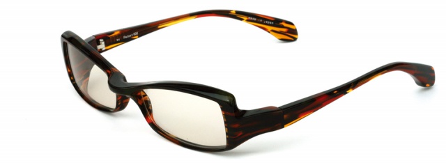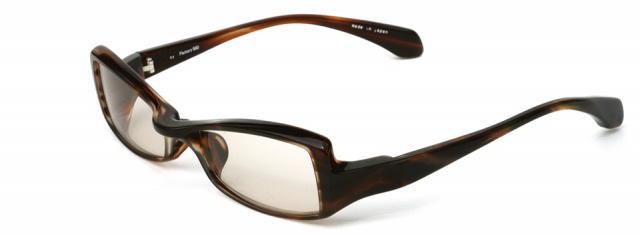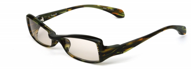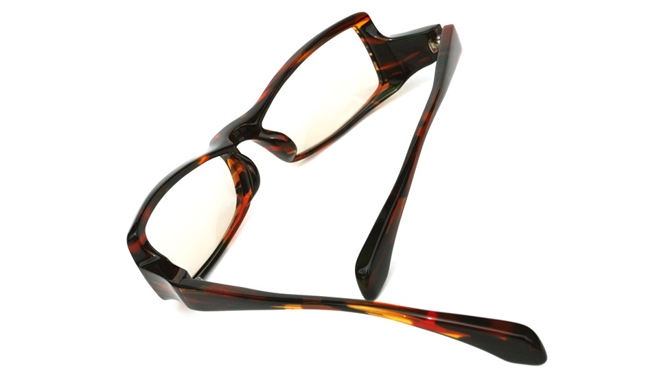 フルリムのアンダーテンプルモデル。フロントサイドからテンプルまでの流れるようなラインが特徴で、ヨロイを逆Rに窪ませることでフレームが顔に沿うようになっています。少しつり上がったフロントは目元を強調する効果があり、フォックス風に掛けこなす女性ユーザーも。