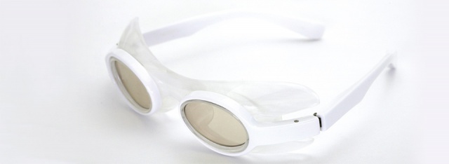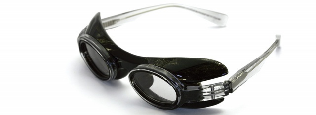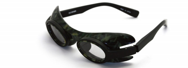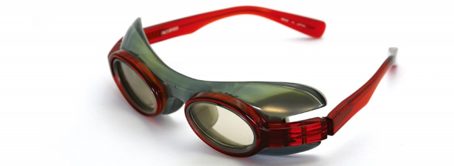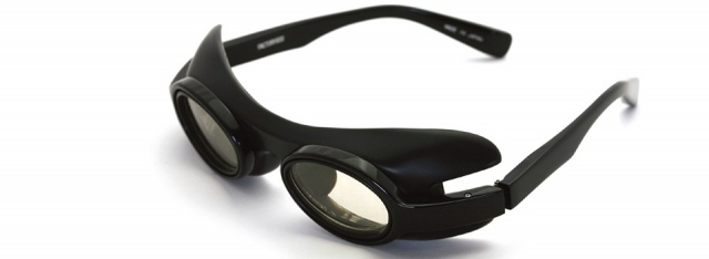 オーバルシェイプのフロントにアセテートのフードを合わせたゴーグルモデル。有機的なフォルムのフードが、顔と眼鏡との隙間を減らして風の巻き込みを軽減します。フードからテンプルが伸びるようなキュートなデザインで、上から見た時にはフレームの一体感が増します。