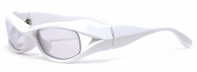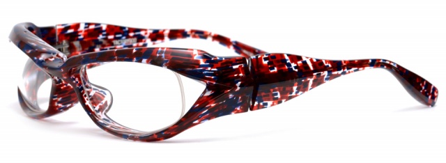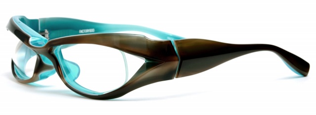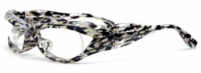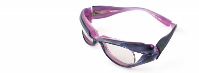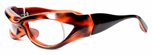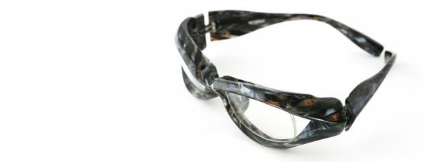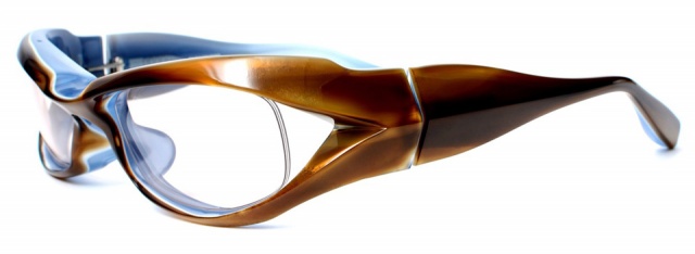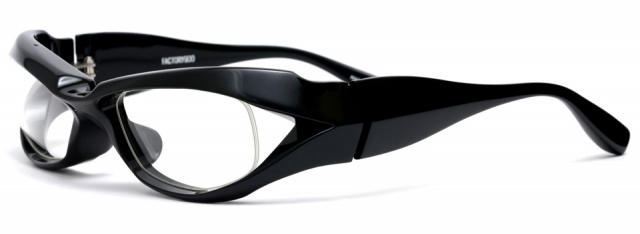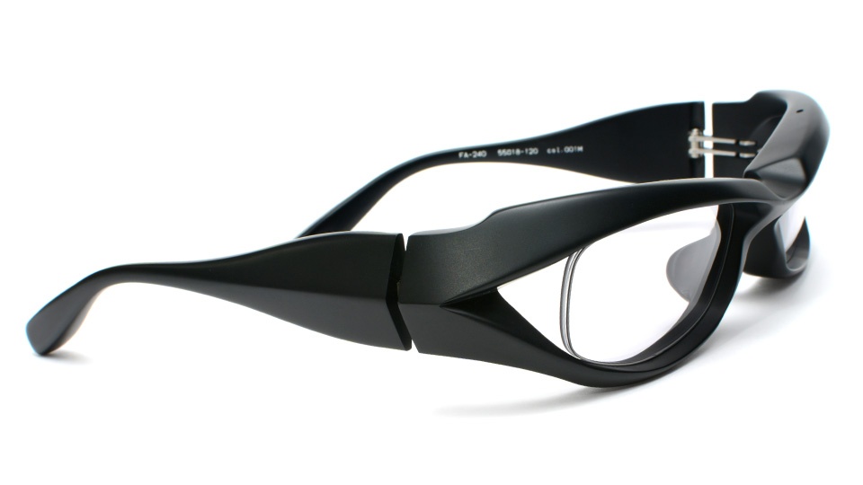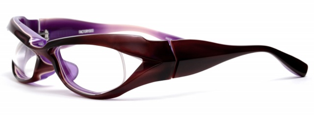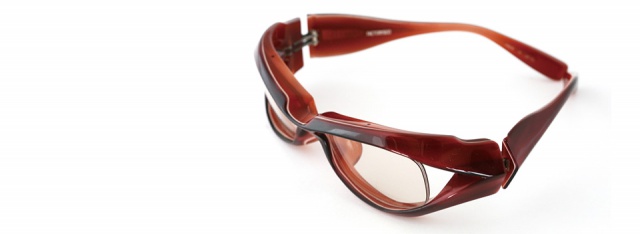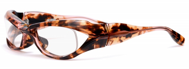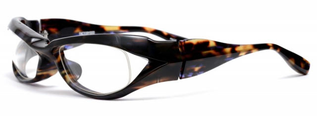 上リム14mm、サイド12mmの極太アセテート生地を採用。重くぼってりした印象にならないよう、ヨロイに鋭角なカッティングを施して美しいラインを際立たせています。ブリッジからブロー、ヨロイ、テンプルまで均整のとれたラインが走る(繋がる)洗練されたデザインです。