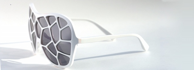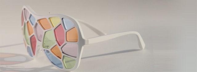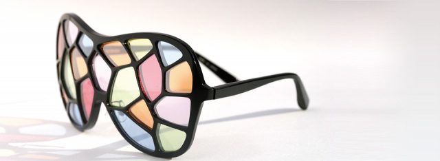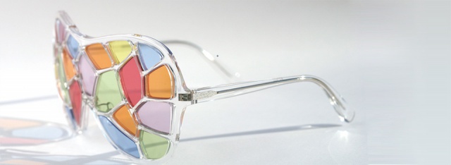 「眼鏡は二眼じゃないとダメなのか?」。そんな問いかけから生まれたのが、20個のピースから成り立つサングラスです。ステンドグラスを思わせるカラフルな色彩で、掛けると楽しい気分になれるはず。そこには「明るくてHAPPYな眼鏡を作ってみよう」という想いも込められています。