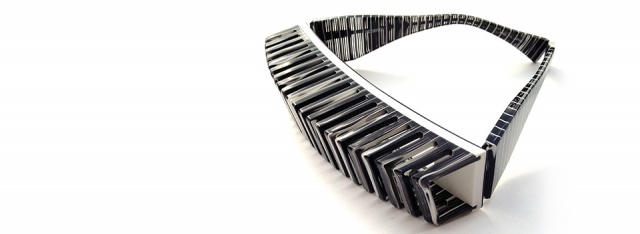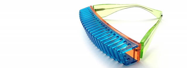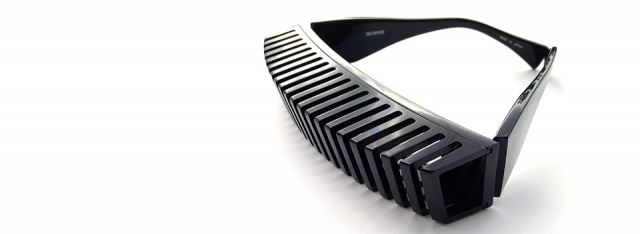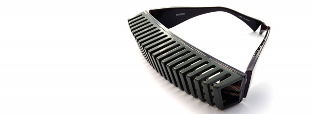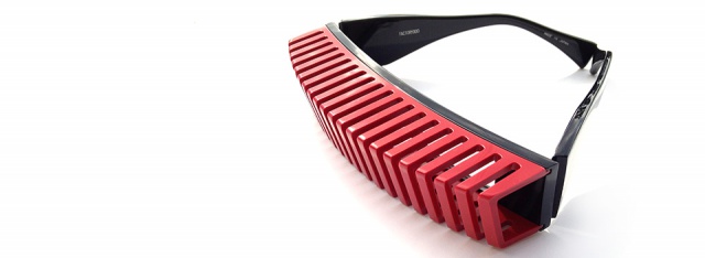 縦にスリットの入った立体的なパーツと、平面的なフロントを別パーツで作り、それを組み合わせることにより、レンズとの間に空間が生まれる構造体を作り出した。その構造体はメガネというよりは、まさに建造物を彷彿とさせるようなスタイルとなっている。