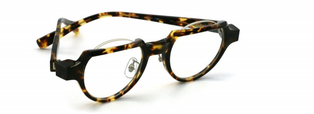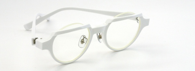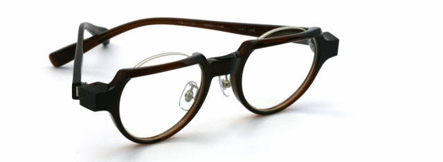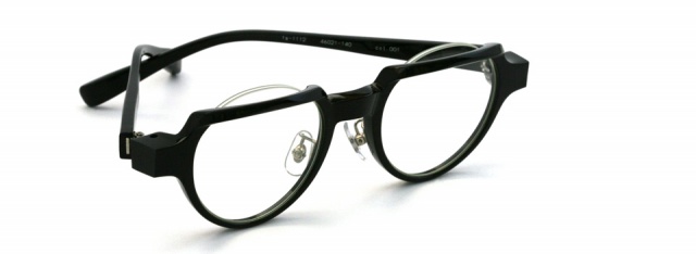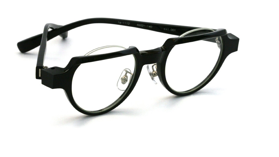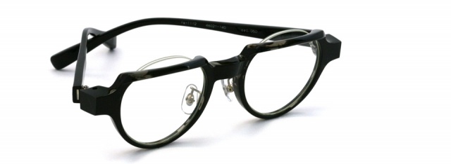 リムを折り曲げる fa-1111 シリーズ。 上面のリムを折り曲げ、意図的にフラット面をつくりクラウンパント風に仕上げた。 見る角度によってメガネの表情が変わるだまし絵的な要素も。