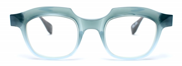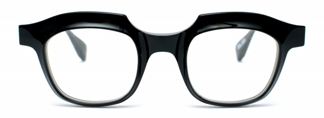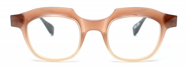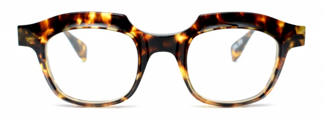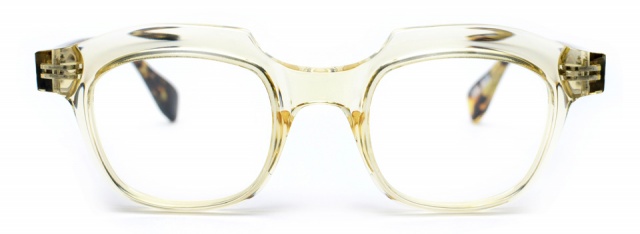 フロント前面を逆アールで削ぎ落とした特徴的なモデル。アセテートの持つ質感を、フロント面に施したカットが光の流れに変化をつけ、今までにない表情を演出している。スクエア型のレンズシェイプがエッジの効いた造形と調和し、カジュアルに偏ることなく上品さを併せ持ったクラシックフレームとなっている。