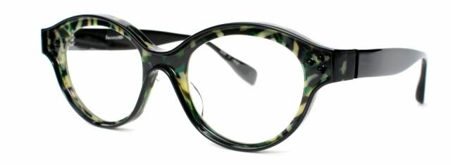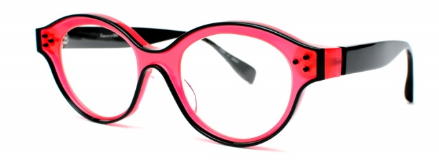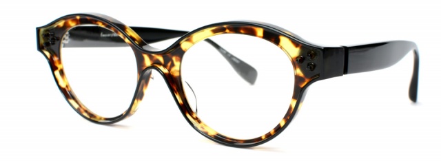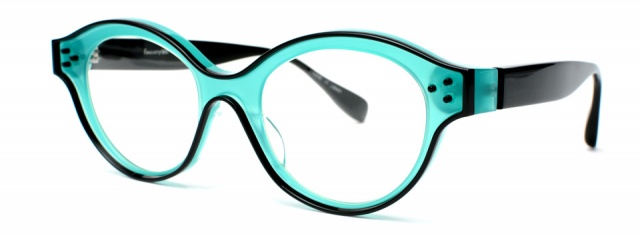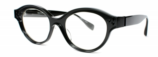 メガネの縁取りと共に飾り鋲を残して、よりポップなテイストを表現。縁取りの色とテンプルも黒に統一し、ベースの色をひきたたせている。厚さを6mmと全体を薄くして、かけ心地も考慮した仕上りに。