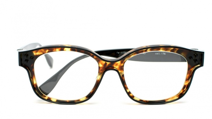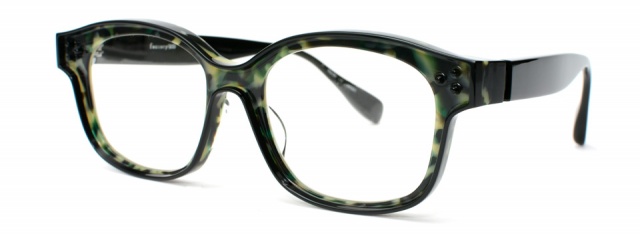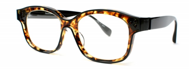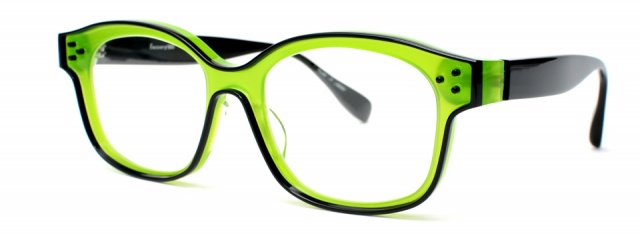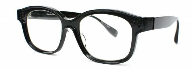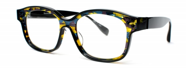 メガネの縁取りと共に飾り鋲を残して、よりポップなテイストを表現。縁取りの色とテンプルも黒に統一し、ベースの色をひきたたせている。厚さを6mmと全体を薄くして、かけ心地も考慮した仕上りに。