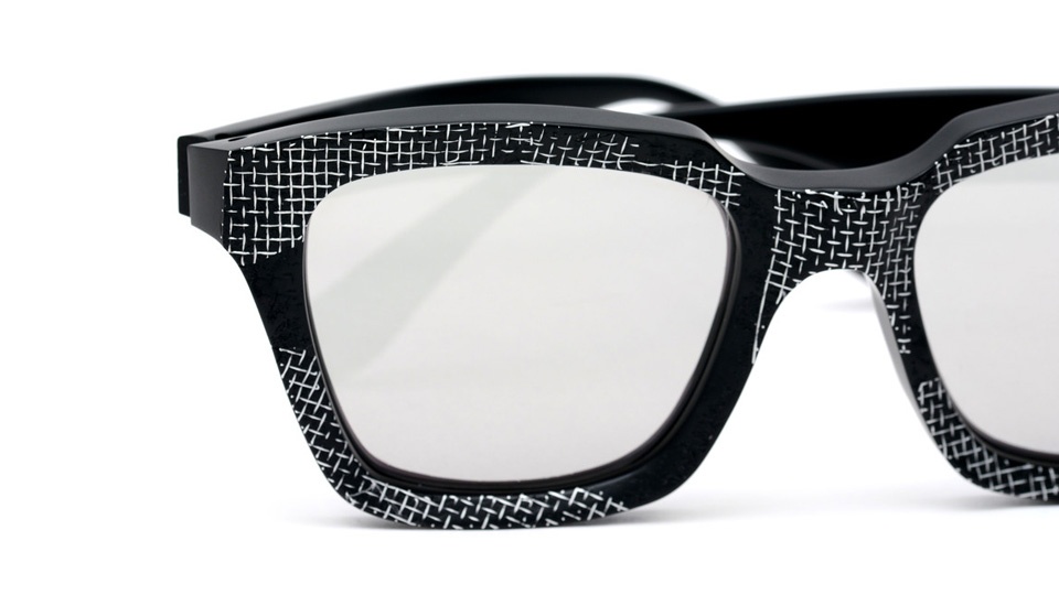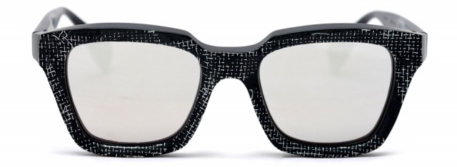 アセテートの新たな可能性を追求し、表面処理にフォーカスを当ててつくられたモデル。 立体転写技術を用い、テレビジョンカットのフロント面にステンレスのメッシュを埋め込みダメージ加工を施すことで、敢えて朽ちた表現に。レンズシェイプはビッグサイズのウェリントン型、サングラスレンズには4カーブのフラッシュミラーに強化コートを搭載。ワンランク上のスタイリングに。