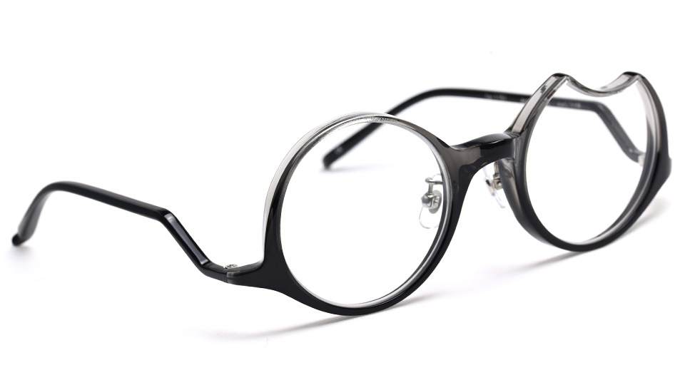 女性の方に着用していただくことを前提に、小ぶりなサイズ感となっております。『月』をコンセプトに作られ、左は上弦の欠けた月、右は満月というアシンメトリーなレンズ形状。テンプルは月にかかる雲をイメージし、角度によって表情を変える独特な形状になっています。全体的に細身ながらも、ギミックの効いたデザインがメリハリを生み出しています。