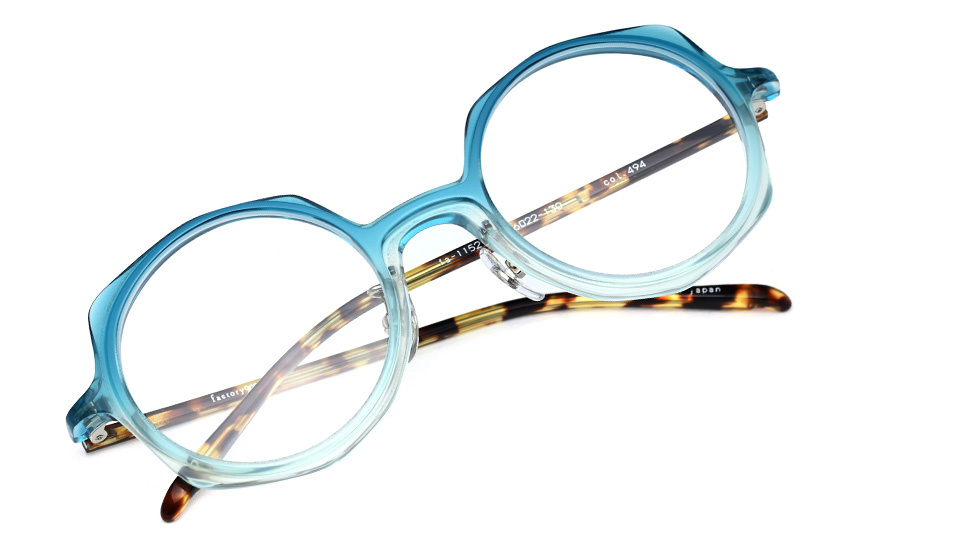 女性の方に着用していただきやすいサイズ感となっています。シンプルなラウンドシェイプのレンズを縁取るように、フロント形状は多角形のリムがアクセントに。正面から切削を施し立体感を持たせることで、程よいクセを残しながらも、顔なじみの良さを実現しました。レンズを縁取るリムのラインが、カラーによって多彩な表情をもたらします。
