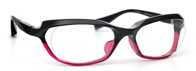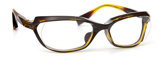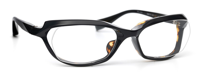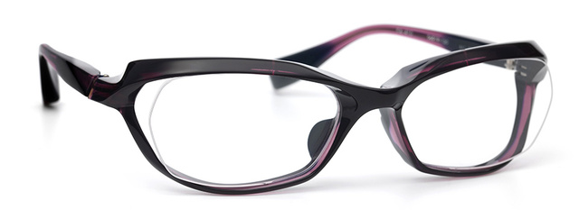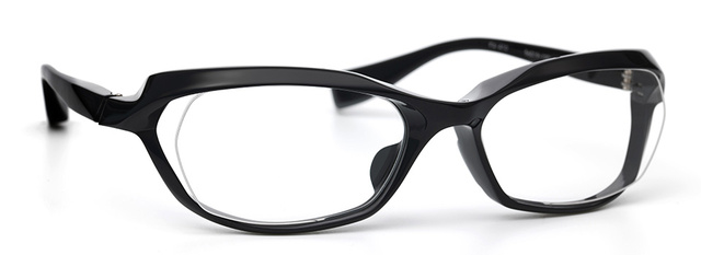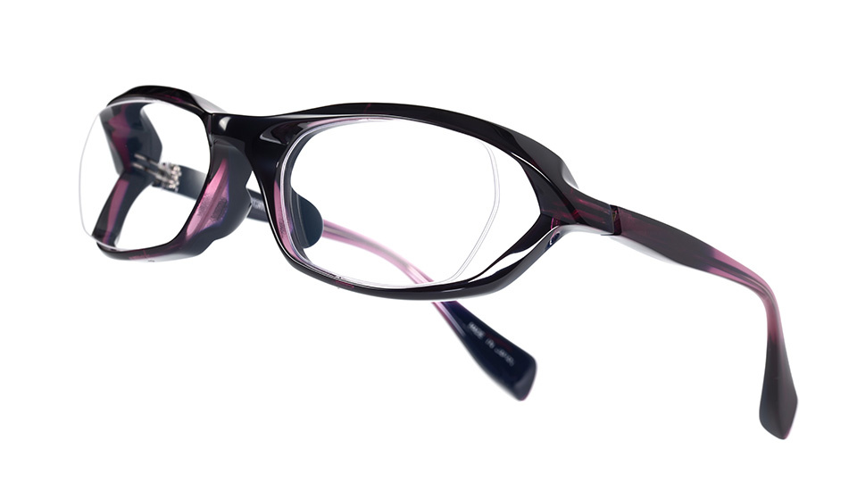 逆三角形のテンプルを採用し、細身のシェイプに面を持たせ、